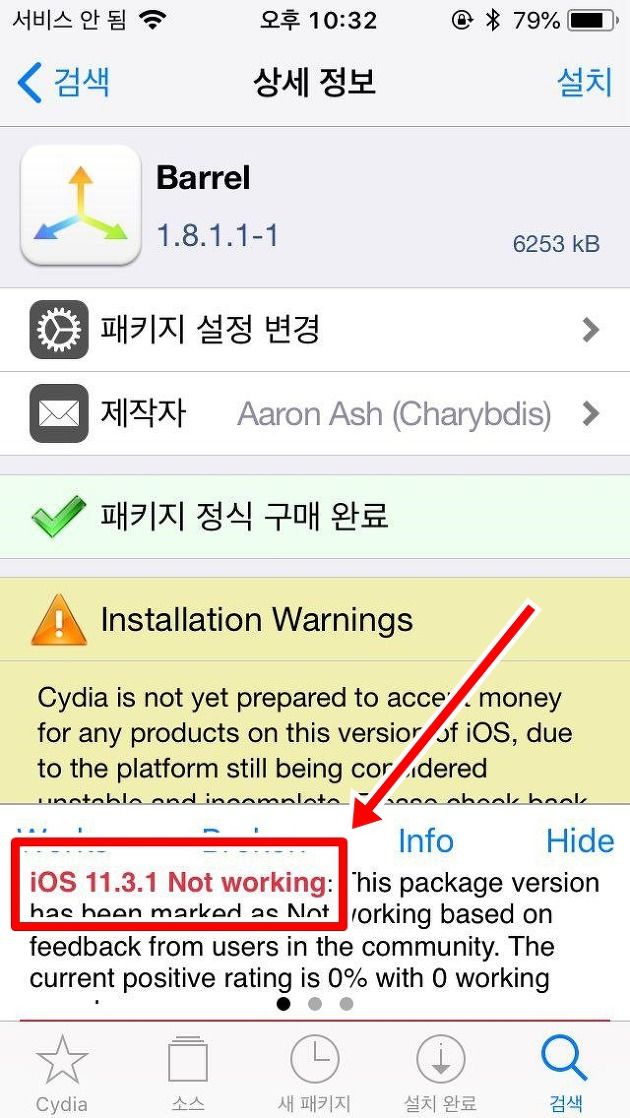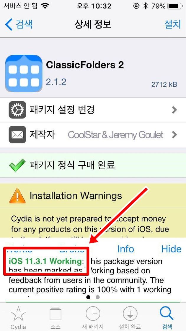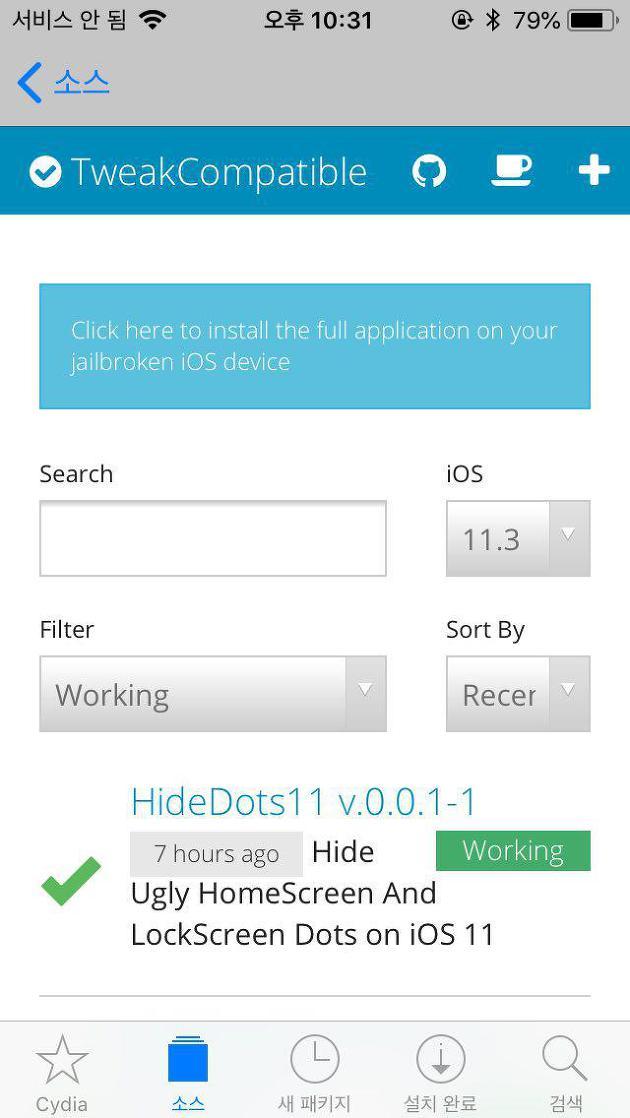 트윅 설치 후 시디아에 들어가 보면 아래와 같이 iOS 11.3.1 탈옥 호환 여부를 쉽게 확인할 수 있는데요.