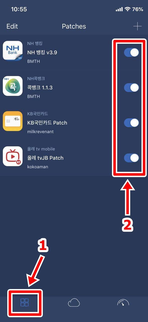 화면 하단 왼쪽의 아이콘을 터치하면 다운로드된 탈옥 우회 패치 앱 목록이 보이는데요. 아래 그림처럼 버튼을 켭니다. 그리고 리스프링합니다. 그러면 탈옥 아이폰에서 은행 앱 및 카드 앱을 사용할 수 있습니다. 하지만 Flex 3 Beta 트윅으로 모든 은행 앱 및 카드 앱을 사용할 수 있는 것은 아닙니다. 저는 NH 뱅킹, 콕뱅크, KB 국민카드 앱, 올레tv모바일 앱을 사용하고 있는데요. 다행히 탈옥 아이폰에서 잘 실행되고 있습니다.^^(개인적으로 금융권 앱이 실행되는지 질문은 받지 않습니다.^^;;)