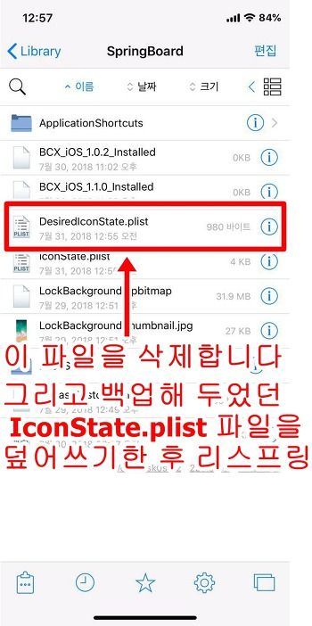 폴더 풀림 오류가 생기고 난 후 /var/mobile/Library/SpringBoard/ 폴더에 DesiredIconState.plist 파일이 보이면 이 파일을 삭제합니다. 그리고 백업해 두었던 IconState.plist 파일을 덮어쓰기하고 리스프링하면 됩니다.