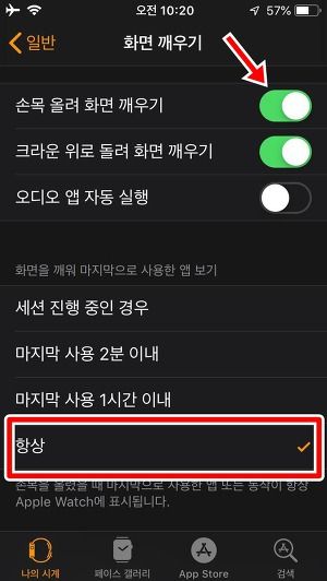 Step4. 애플워치>나의 시계>일반>화면 깨우기에서 손목 올려 화면 깨우기 버튼을 켜고, '화면을 깨워 마지막으로 사용한 앱 보기'의 항상을 선택합니다.