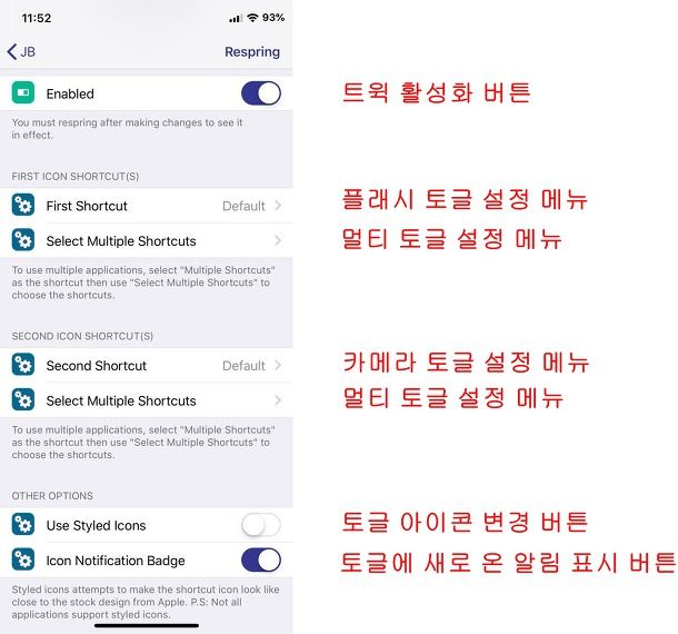 트윅 설치 후 아이폰 설정에 Jumper라는 메뉴가 생기는데요. 거기서 잠금화면 하단 토글 설정을 변경하면 됩니다.