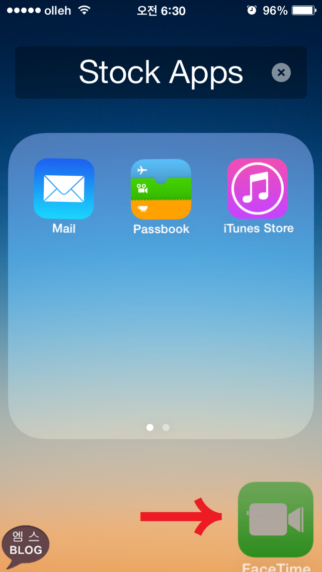 1. 사라진 어플을 다시 홈화면에서 보이게 하려면 밀어서 전원 끄기를 한 후 다시 전원을 키면 됩니다. 아래 화면은 사라졌던 FaceTime 어플이 다시 복원된 화면입니다. 복원될 때 원래의 자리로 복원되지는 않습니다.