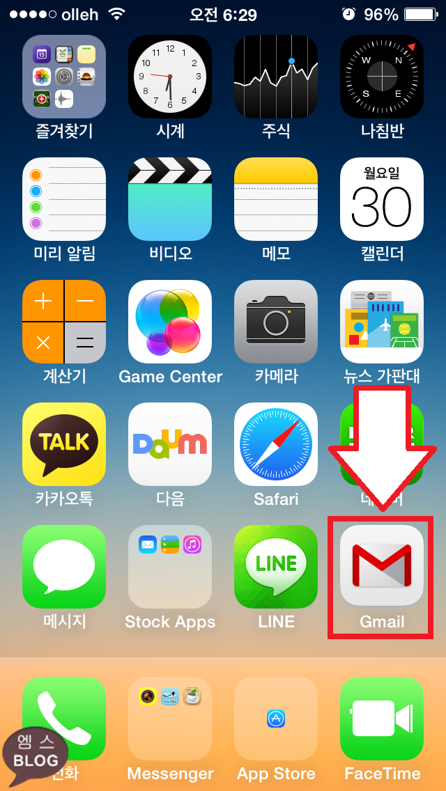 아래의 그림처럼 홈화면 첫페이지를 어플 및 폴더로 가득 채워줍니다. 여기서 주의해야 할 점이 하나 있습니다. 아래그림의 화살표부분(홈화면의 제일 오른쪽 맨 아래, GMail어플자리)에는 반드시 어플이 위치해야 합니다. 그 자리에 폴더가 위치하면 안됩니다.^^ 그리고 숨기고자 하는 어플을 하단 독에 위치시켜놓습니다. 저는 FaceTime 어플을 없애보겠습니다.^^