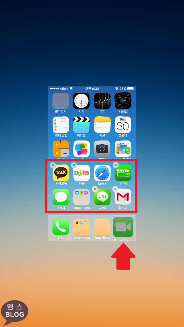 STEP2. 없애려는 어플을 터치하고 있는 상태에서 홈버튼을 연속 2번 누릅니다. 이 때 중요한건 타이밍 입니다. 어플을 터치하고 바로 홈버튼을 연속으로 2번 눌러 멀티태스킹 화면으로 넘어가야 합니다. 타이밍이 맞지 않으면 원활히 진행되지 않습니다.
