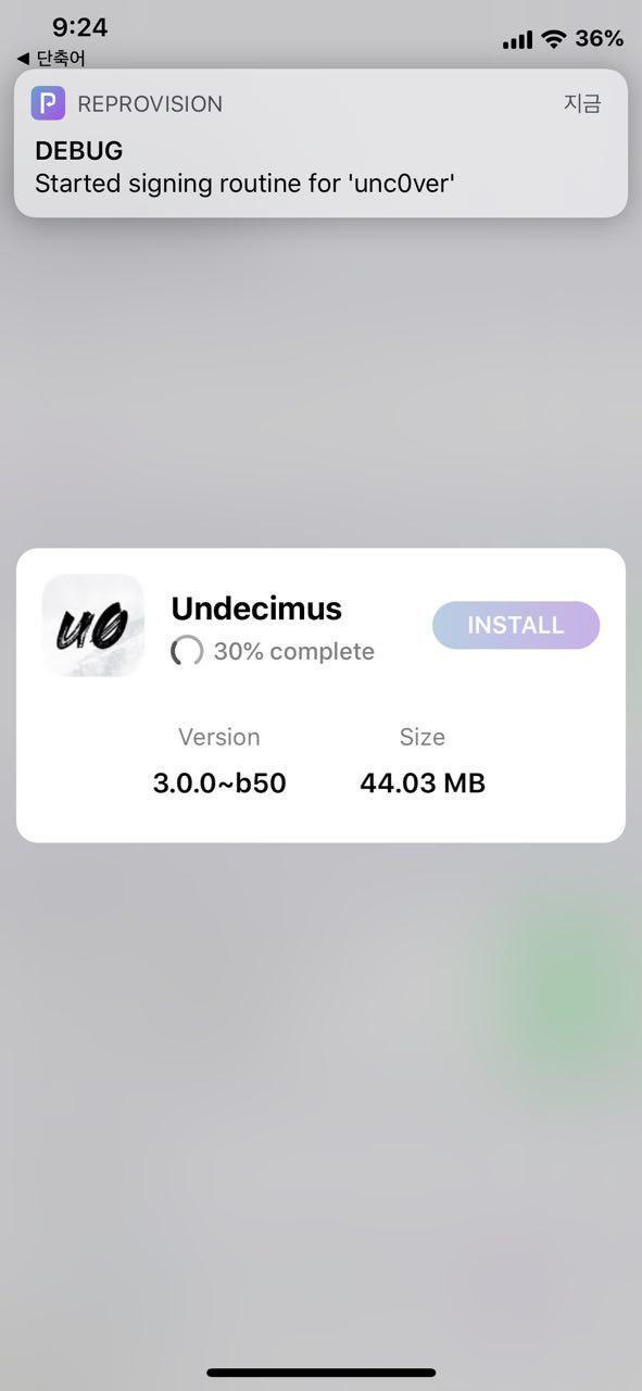 Step4. 최신버전의 unc0ver 앱이 다운로드 완료되면 아래 그림과 같이 INSTALL 팝업창이 나타나는데요. INSTALL 버튼을 터치하여 최신 버전 unc0ver 앱을 설치합니다. 설치 완료 후 팝업창 왼쪽 상단의 ⓧ버튼을 눌러 밖으로 나옵니다.