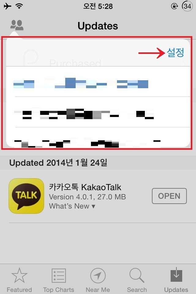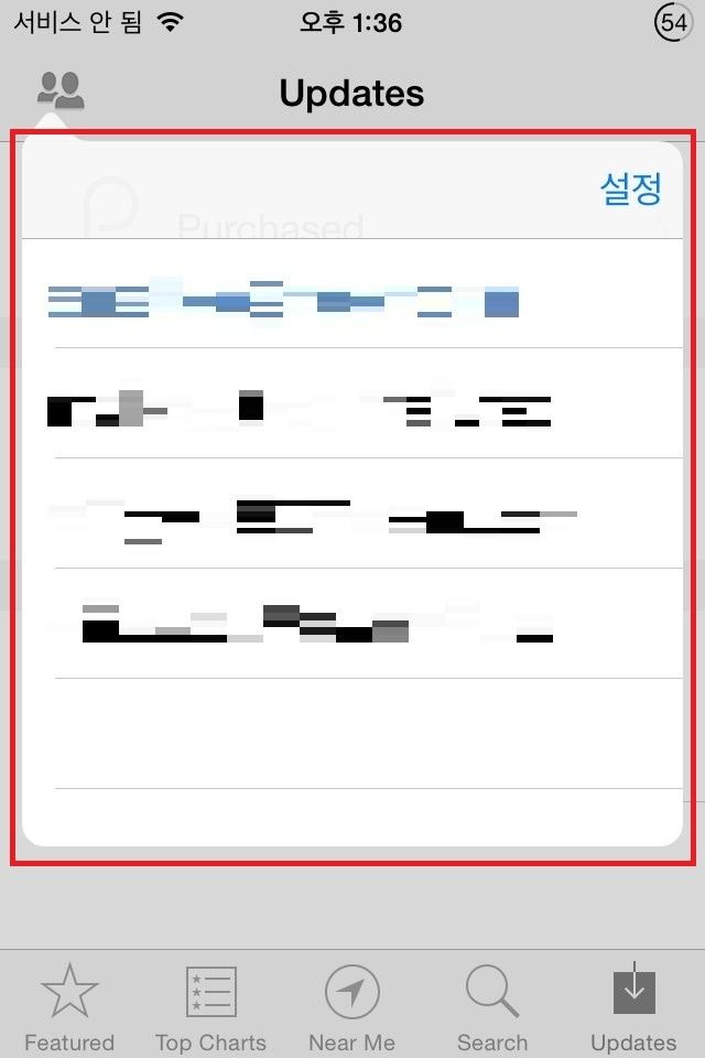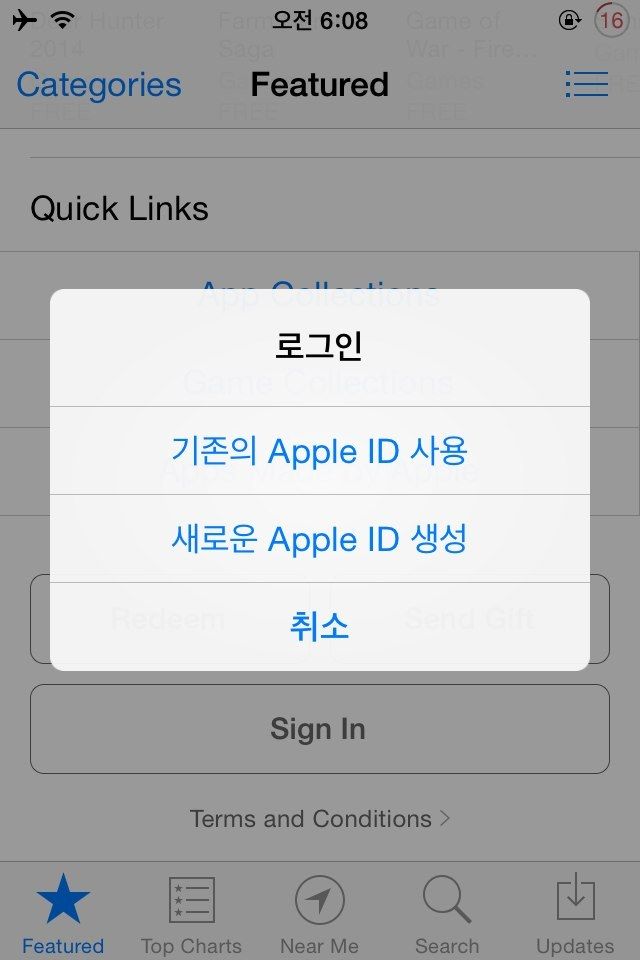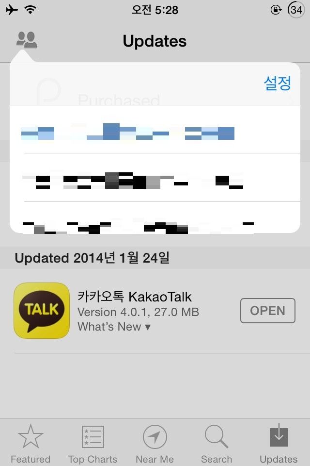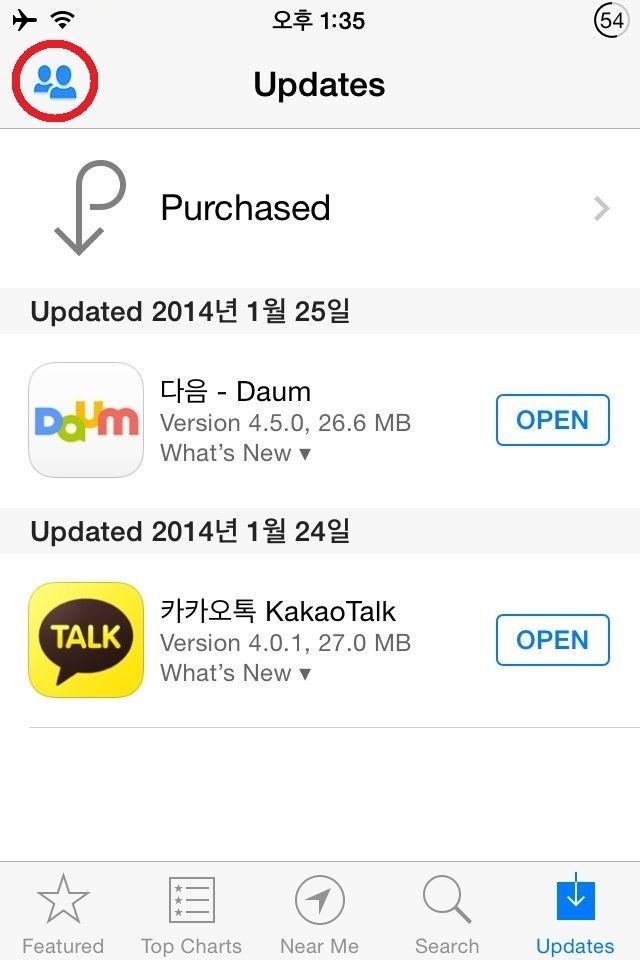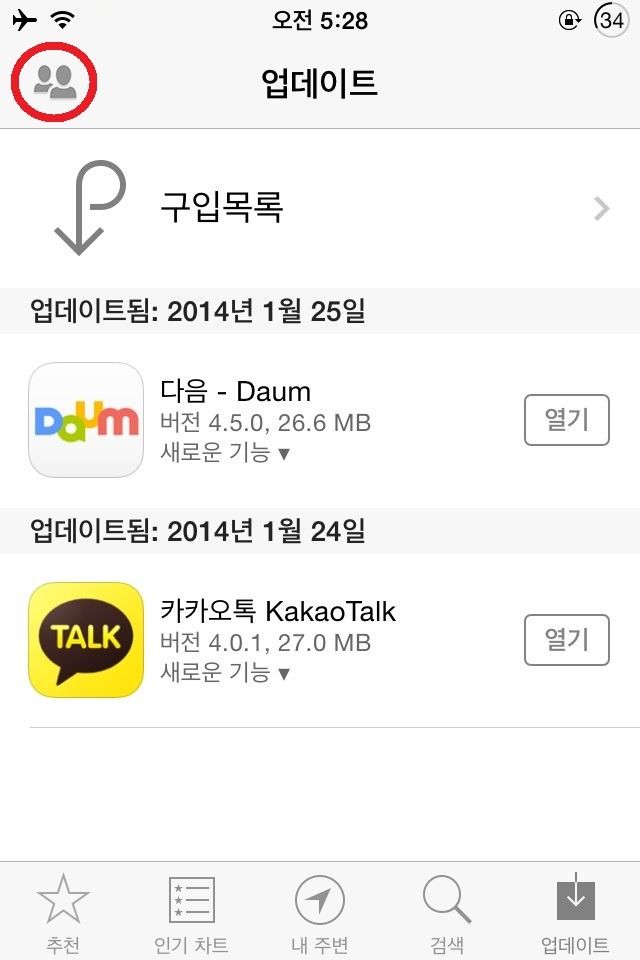 앱스토어 어플을 실행한 뒤 하단 메뉴 중 업데이트(Updates)를 터치해 보면 화면 상단 왼쪽에 사람모양의 아이콘이 생긴 것을 볼 수 있습니다. 아이콘의 색이 회색이면 로그인이 되지 않은 상태이며, 파란색이면 로그인이 되어 있는 상태를 의미합니다.