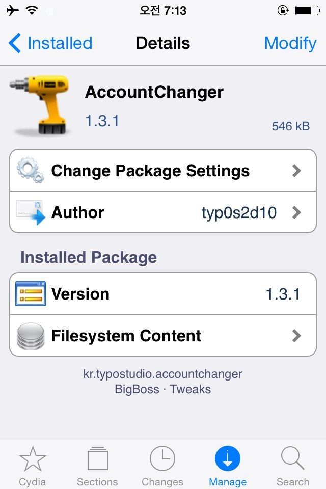 시디아에서 AccountChanger를 검색해 Install합니다. 트윅 설치 완료 후 기기가 리스프링되면 AccountChanger 트윅을 사용할 수 있게 됩니다.