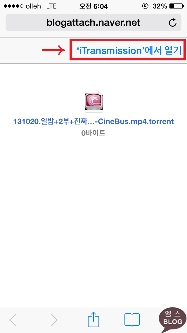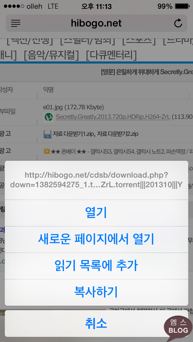 화면 상단의 'iTransmission'에서 열기를 터치하면 동영상을 다운받을 수 있습니다. 그러나 'iTransmission'에서 열기를 터치해도 아무런 반응이 없다면, 토렌트 파일을 길게 누른 뒤 복사하기를 터치합니다.
