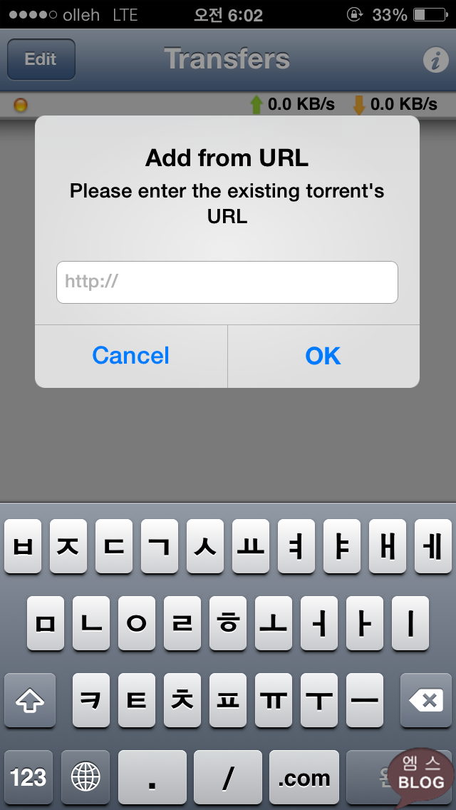 그리고 iTransmission 어플을 실행한 다음 + 버튼을 터치하고 URL을 터치한 다음 복사한 URL을 붙여넣기 하면 동영상을 다운로드 받을 수 있습니다.
