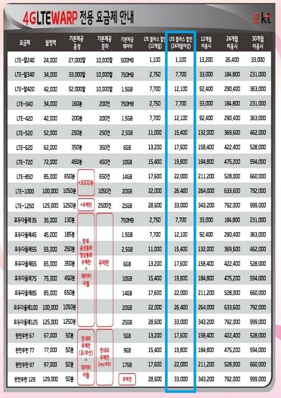 290,400원을 24개월로 나누면 12,100원이라는 금액이 나오는데요. 이 금액은 모두다올레45 요금제 사용시 할인 받게 되는 요금제 할인금액이었습니다(위 KT 요금제 그램 참고).