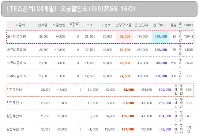 문제2) 아래는 아이폰5S 16GB를 24개월로 약정했을때 요금할인표입니다. 할부원금은 얼마일까요?