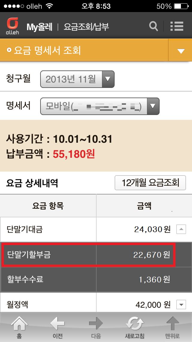 할부원금은 통상적으로 통신사 약정기간(보통 24~36개월)동안 통신비와 함께 청구되는데요. 스마트폰 구입 후 첫 달 명세서에 나오는 단말기할부금을 보면 자신의 할부원금을 정확히 알 수 있습니다(아래그림참고).