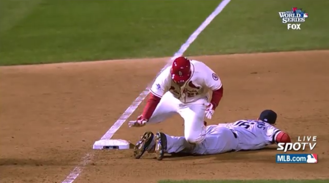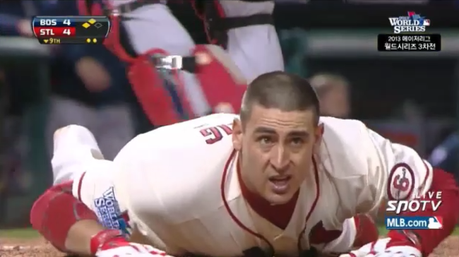 세인트루이스 7번 타자 존 제이가 친 타구가 2루수 앞 짧은 땅볼로 굴러갔으나, 3루주자 몰리나는 홈으로 대쉬. 그 결과 몰리나는 홈에서 태그아웃이 되었고 그 사이 2루주자는 3루로 뛰어갔습니다. 이에 보스턴 포수 살타라마치아는 2루주자의 3루 진루를 막기 위해 성급히 3루로 송구를 합니다.