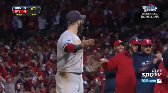 어제 한국시각으로 2013년 10월27일 오전 9시 미국 메이저리그 월드시리즈 3차전이 열렸습니다. 시리즈 전적 1승1패로 팽팽하게 맞선 보스턴 레드삭스와 세인트루이스 카디널스의 월드시리즈 3차전에서 정말 희귀한 상황이 나왔는데요.