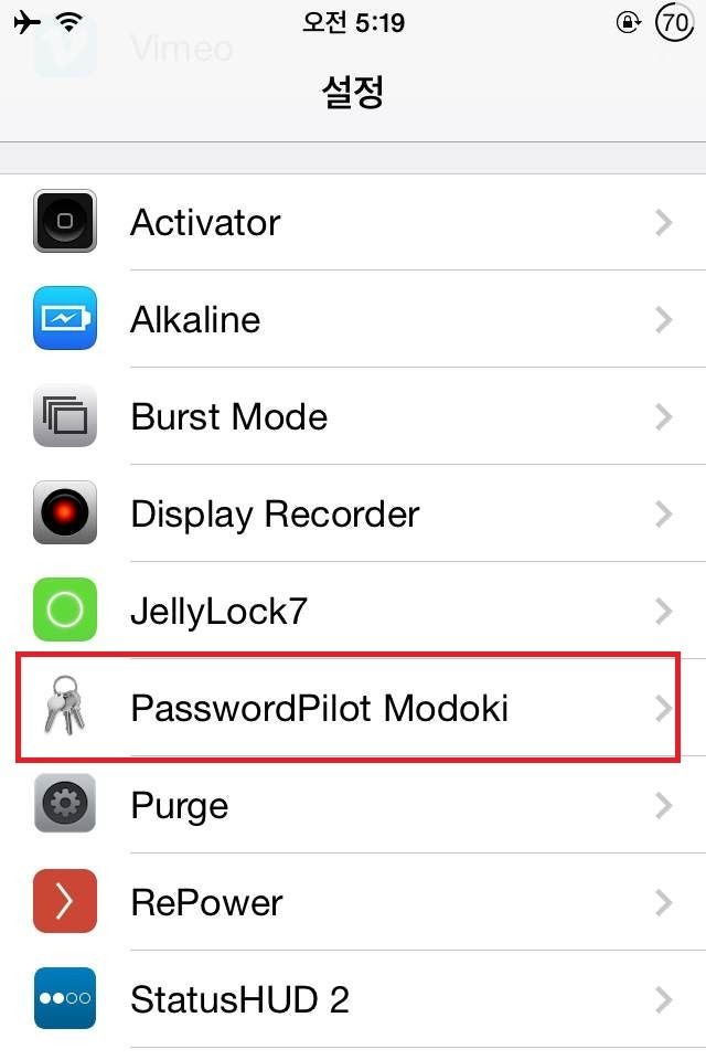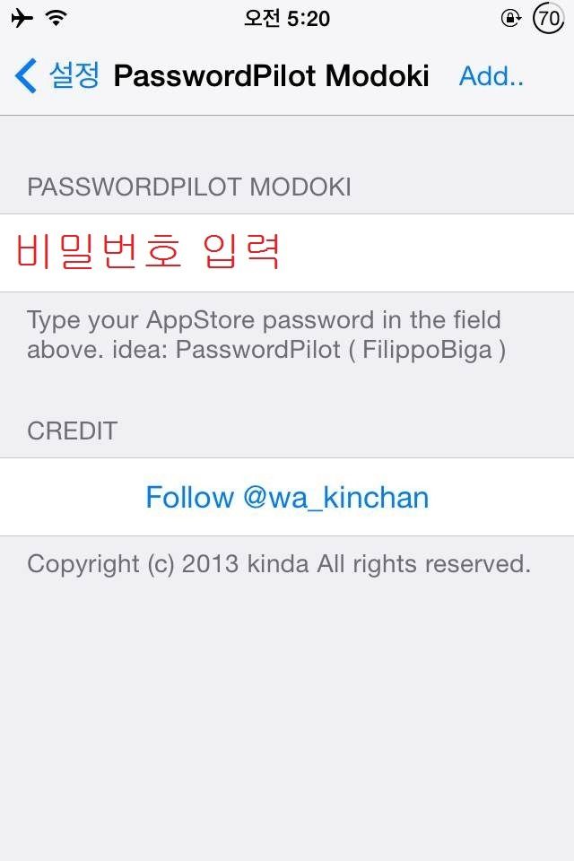 트윅 설치 후 아이폰의 설정을 들어가보면 PasswordPilot Modoki 메뉴가 생깁니다. 해당 메뉴로 들어가 앱스토어 계정 아이디의 비밀번호를 입력하면 됩니다.