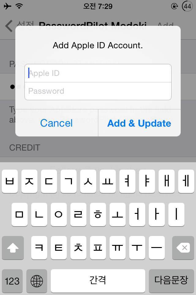 미국 계정, 한국 계정 등 앱스토어의 계정 아이디가 여러개이고 비밀번호가 다를 경우 설정-PasswordPilot Modoki 화면 상단 오른쪽의 Add..를 눌러 비밀번호를 추가할 수 있는데요. 추가할 계정 아이디와 비밀번호를 입력하고 Add & Update를 누르면 됩니다.
