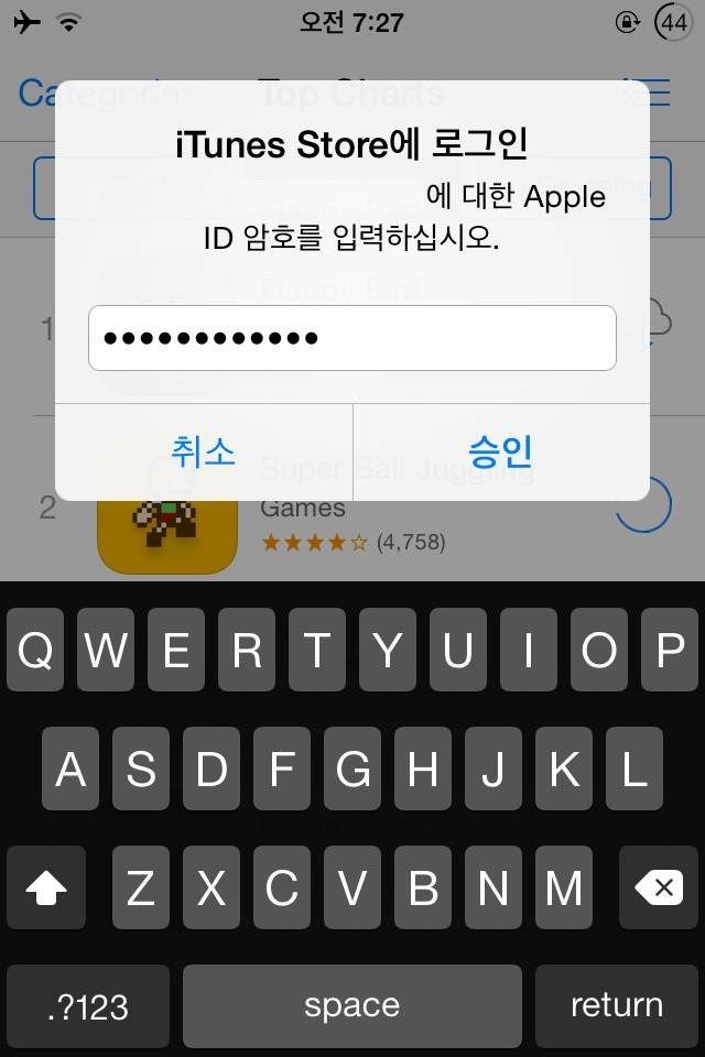 아래는 앱스토어 로그인 화면입니다. 그림처럼 비밀번호가 자동으로 입력되어 나타나게 됩니다. 만약, 아래 그림처럼 비밀번호가 입력되어 나타나지 않으면 앱스토어 계정을 로그아웃 후 재로그인한 다음 설정-PasswordPilot Modoki 에 다시 비밀번호를 입력하면 됩니다.