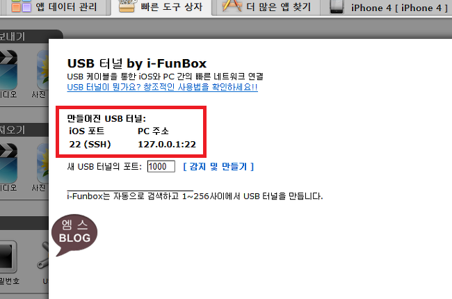 STEP1. 아이폰을 컴퓨터와 연결한 후 아이펀박스를 실행합니다. 그리고 아래 그림처럼 USB 터널을 클릭합니다.