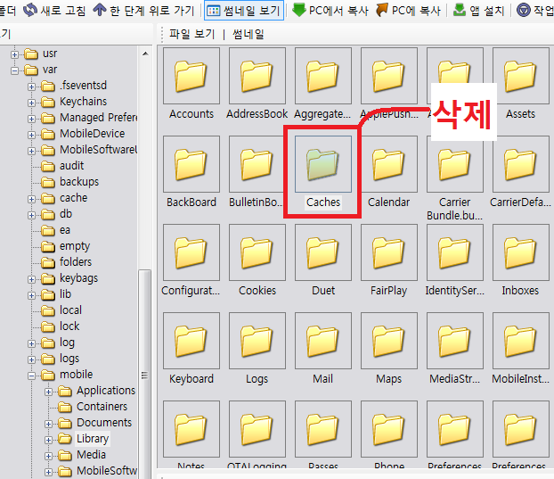 <첫번째 방법. /var/mobile/Library/Caches 폴더 삭제하는 방법>