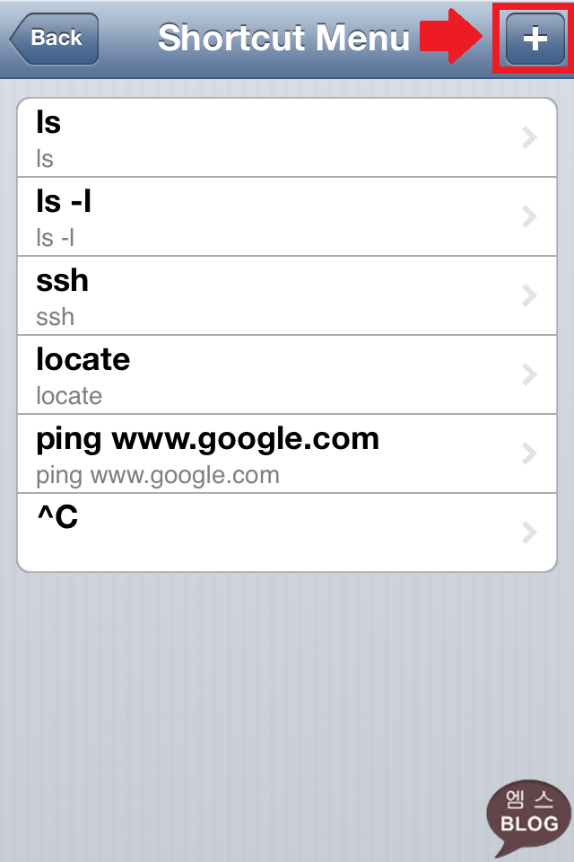 그리고 모바일터미널 화면으로 돌아와 키보드 상단 왼쪽에 있는 파란색버튼(아래그림참고)을 눌러 Shortcut Menu가 제대로 저장이 되었는지 확인합니다.