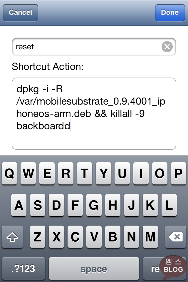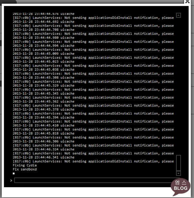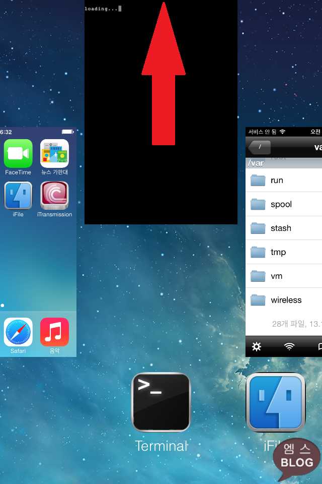 이 작업은 시디아 Mobilesubstrate 트윅을 재설치하는 작업입니다. iOS7 반탈의 경우 재부팅을 하게 되면 이 트윅이 정상작동을 하지 않기 때문에 모바일터미널을 이용해 재설치하는 작업을 해야하는데요.