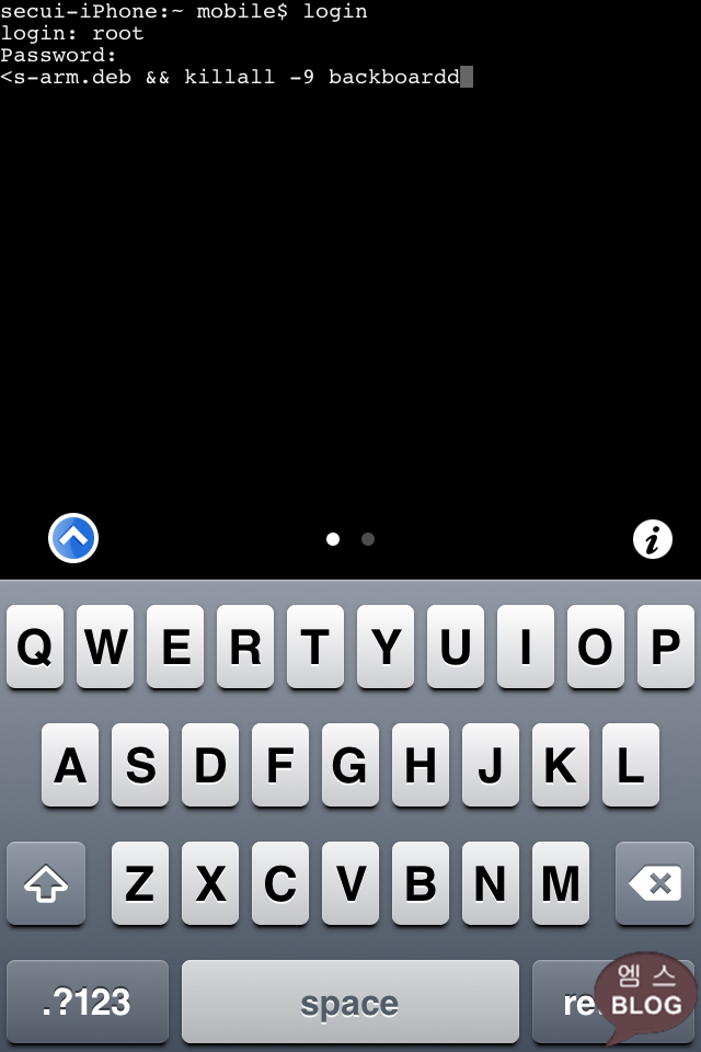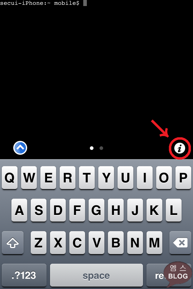 STEP2. 아이폰4에서 모바일터미널(MobileTerminal)을 실행합니다. 모바일터미널 화면의 키보드 상단 오른쪽에 있는 ⓘ를 터치합니다.