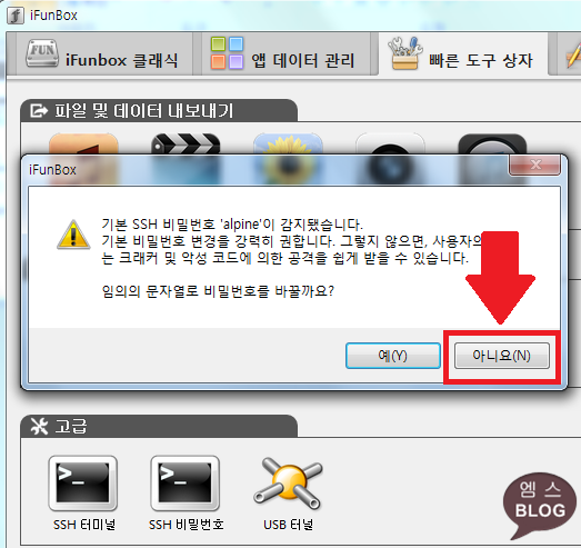 STEP2. 아이펀박스의 SSH 터미널을 실행합니다. 만약, 아래와같은 팝업창이 뜨면 아니요를 클릭합니다.
