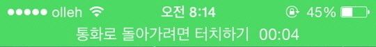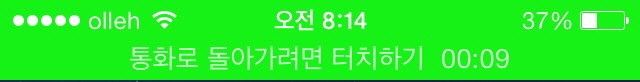 아이폰으로 통화중 홈버튼을 한번 누르면 통화 화면에서 홈화면으로 바뀌게 됩니다. 그리고 홈화면 상단에는 "통화로 돌아가려면 터치하기"라는 문구와 함께 상단바 색깔이 녹색으로 표시되는데요. 이 색깔이 너무 밝아 눈이 아팠는데요. iOS 7.1 베타2에서는 상단바 색깔을 연하게 바꿨습니다. 확실히 눈에 피로가 덜 갑니다. 아래의 그림을 비교해보니 확 차이가 나네요.