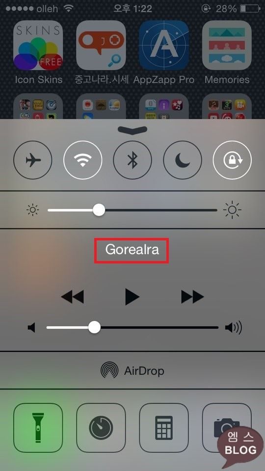 음악 및 Podcast 등 미디어 관련 어플을 실행한 후 종료했을 때 위 그림처럼 제어센터 화면 중앙에 바로 직전에 사용했던 미디어 어플명이 표시됩니다. 예전에는 빈 공간이었으나 빈 공간의 허전함을 어플명으로 채웠습니다.^^ 참고로 모든 미디어 어플명이 표시되지는 않네요.