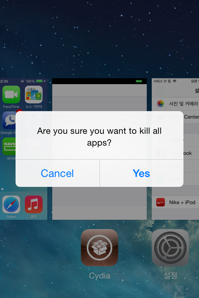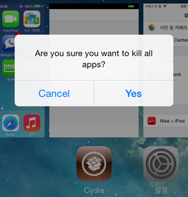 탈옥하기 전 iOS7 아이폰 멀티태스킹 화면의 홈화면을 위로 올리면 실행중인 모든 어플들이 종료되는 기능을 상상한 적이 있었는데요. 실행중인 어플들의 갯수가 많을때는 특히 더 생각이 났습니다.