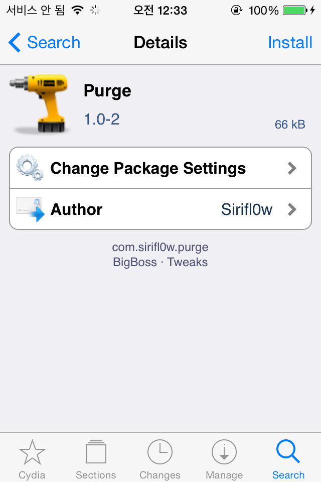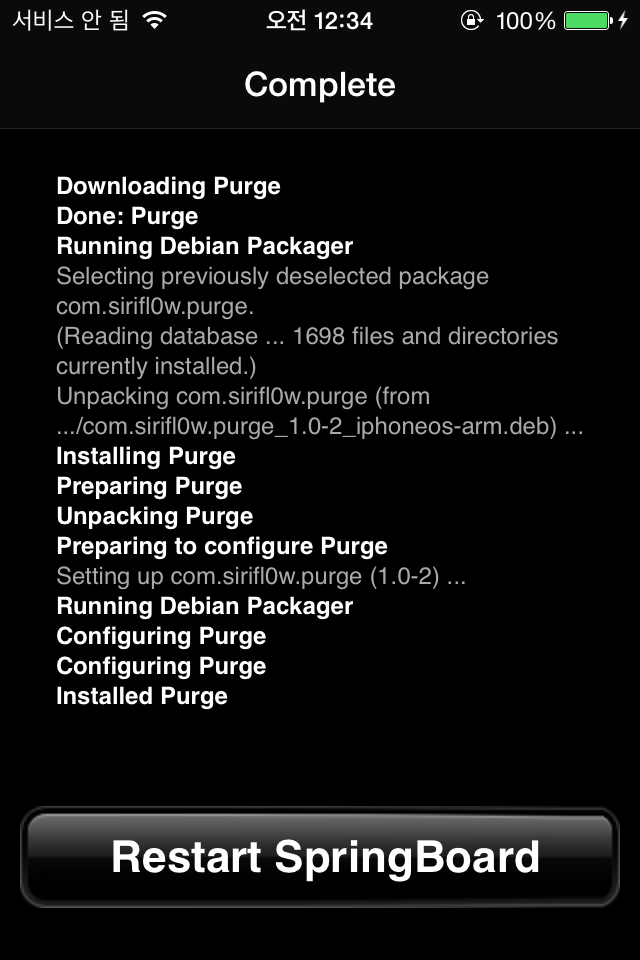 Cydia-Search에서 Purge를 검색한 뒤 Purge 트윅을 Install합니다. 트윅설치가 완료되면 Restart SpringBoard 를 터치합니다.