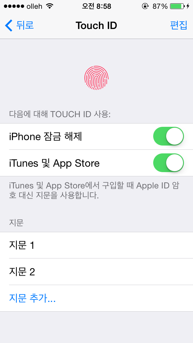 아이폰5S의 가장 큰 특징이라면 지문인식, 터치ID가 되겠다. 이 기능은 아이폰 잠금해제 시, 새로운 앱 다운로드 시에 암호입력 대신 사용되며, 지문등록은 아이폰5S의 설정-Touch ID 및 암호-Touch ID에서 등록 가능하다.