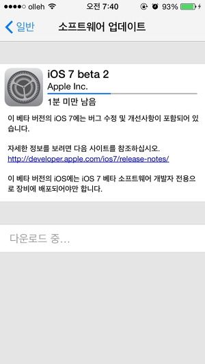 아래그림은 iOS7 beta1에서 iOS7 beta2로 업뎃하는 화면입니다.