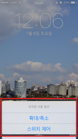 홈버튼을 연속 세번누르면 손쉬운 사용 옵션버튼이 나타납니다(아래그림참고).