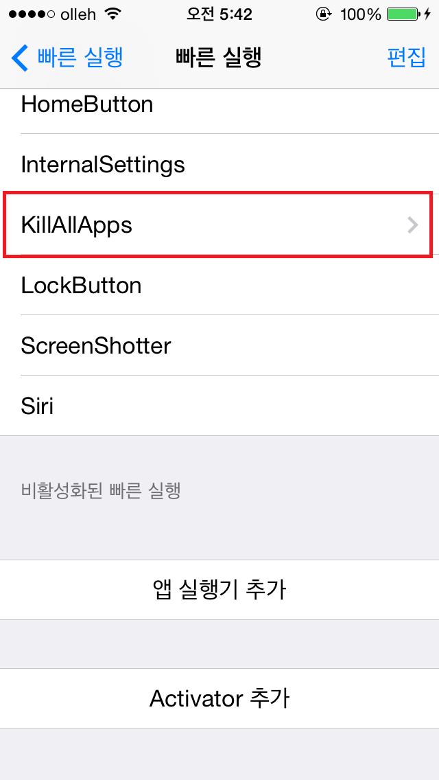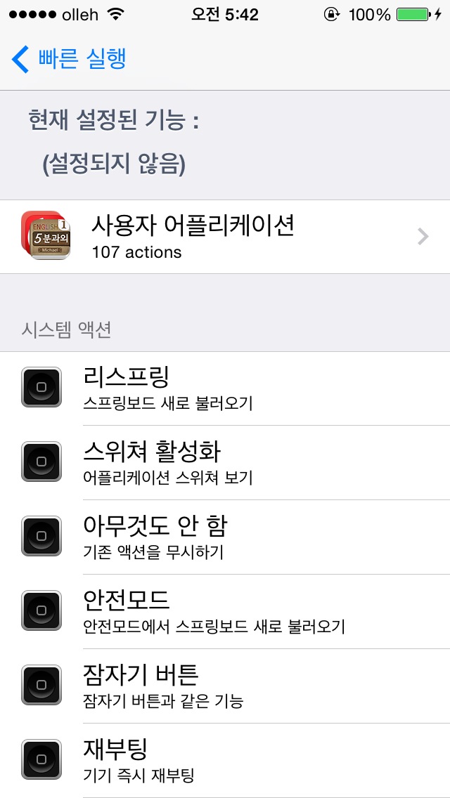 비활성화된 빠른 실행 아래에 있는 앱 실행기 추가를 누르면 애플기기에 설치되어 있는 어플들을 빠른 실행으로 등록해 사용할 수 있습니다(아래그림 참고).
