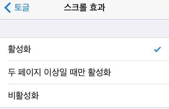 제어센터 토글을 좌우로 쓸어넘길때 바운스 효과를 줄지 말지에 대한 메뉴입니다. 활성화, 비활성화한 경우의 바운스 효과 차이는 첫 페이지와 마지막 페이지가 옆으로 움직이고 안 움직이고의 차이입니다. 한번해보세요. ^^