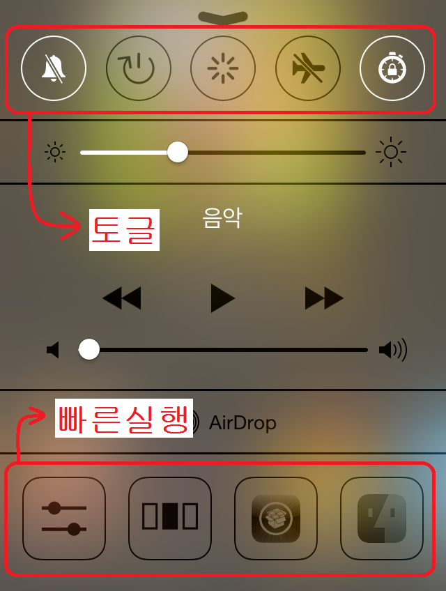 기기의 설정-CCToggles로 들어가보면 토글과 빠른 실행이 보입니다. 하나씩 살펴보겠습니다.