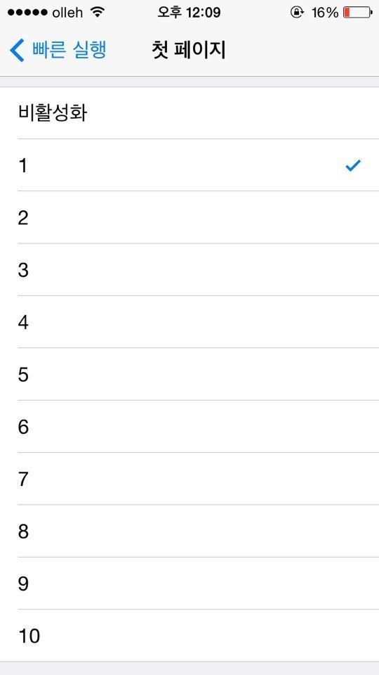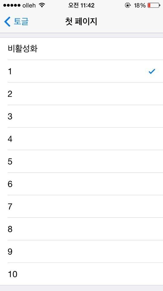제어센터를 활성화 했을 때 첫 화면에 보이게 할 토글 페이지를 결정하는 메뉴입니다. 비활성화를 선택하면 제어센터 활성화 시 마지막으로 사용했던 토글 페이지가 보여지며, 첫 페이지가 보이게 하려면 1을 선택하면 됩니다. 페이지 선택은 아래와 같이 1~10까지 선택 가능합니다.