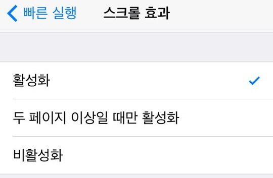 제어센터의 빠른 실행을 좌우로 쓸어넘길때 바운스 효과를 줄지 말지에 대한 메뉴입니다. 활성화, 비활성화한 경우의 바운스 효과 차이는 첫 페이지와 마지막 페이지가 옆으로 움직이고 안 움직이고의 차이입니다. 한번해보세요. ^^