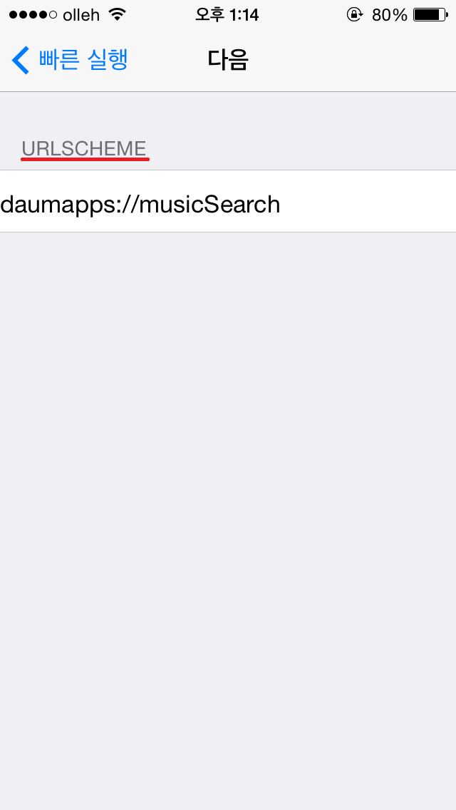 그리고 앱실행기 추가로 빠른 실행에 등록한 어플을 터치해 보면 아래와 같이 URL SCHEME 입력 화면이 나오는데요. 어플을 보다 디테일하게 설정해 놓을 수 있는 기능입니다. 아래는 다음 어플을 빠른 실행에 등록해 놓고 URL SCHEME에 뮤직서치값을 입력해 실행한 화면입니다. 빠른실행의 다음 어플을 터치할 경우 다음 메인화면이 아닌 음악 검색화면이 나오게 됩니다.