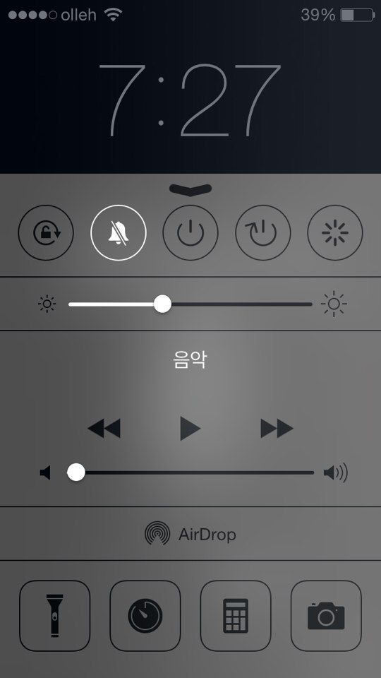 ※ 왼쪽부터 비행기모드 / 와이파이 / 블루투스 / 방해금지모드 / 회전잠금 / 소리끔 / 재부팅 / 리스프링 / 전원끔