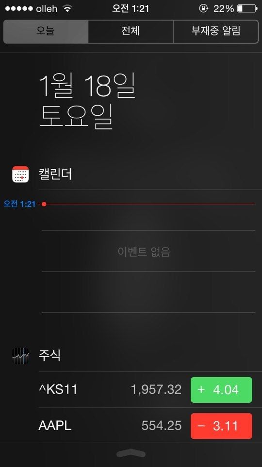 이제는 아이폰의 홈화면 또는 어플실행 중 화면에서 알림센터를 내리지 않고 날짜 및 요일에 대한 정보를 상단바에서 볼 수 있습니다.^^