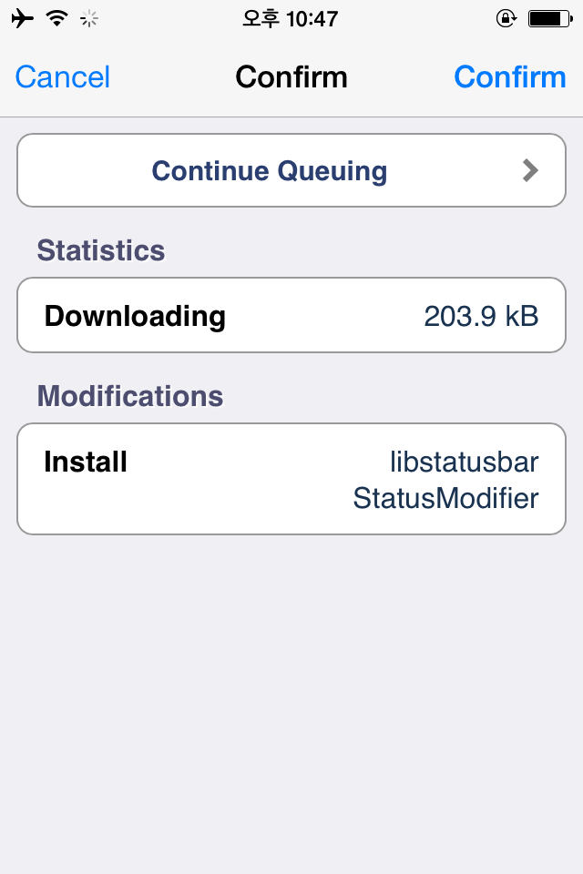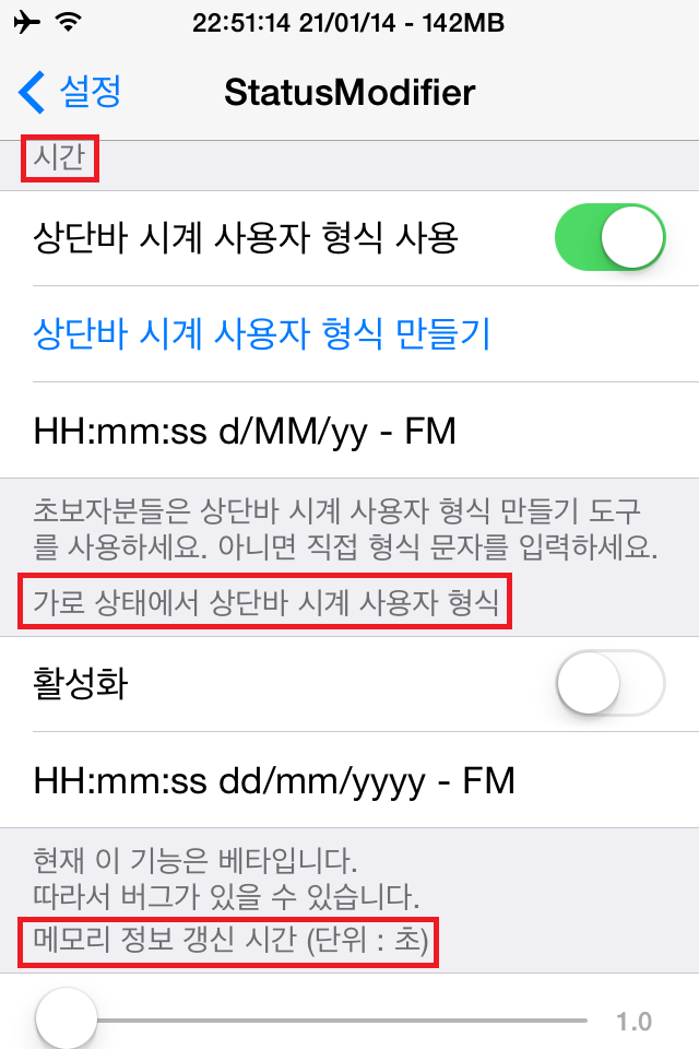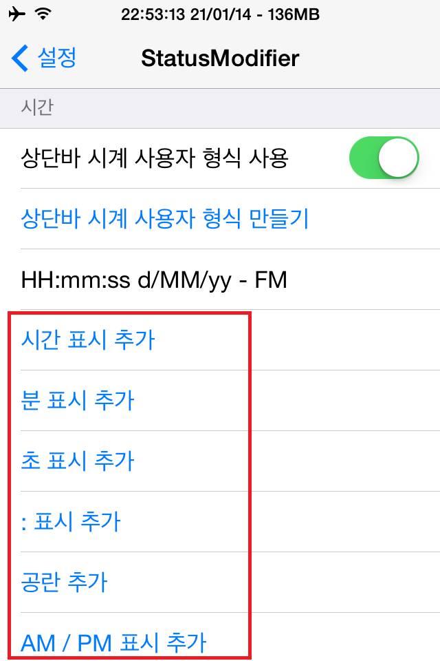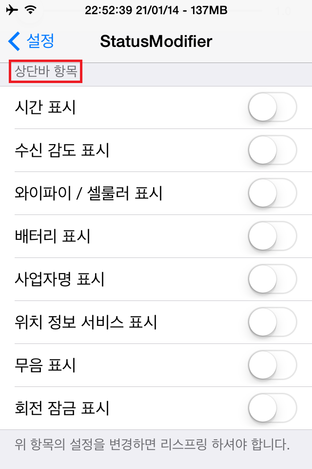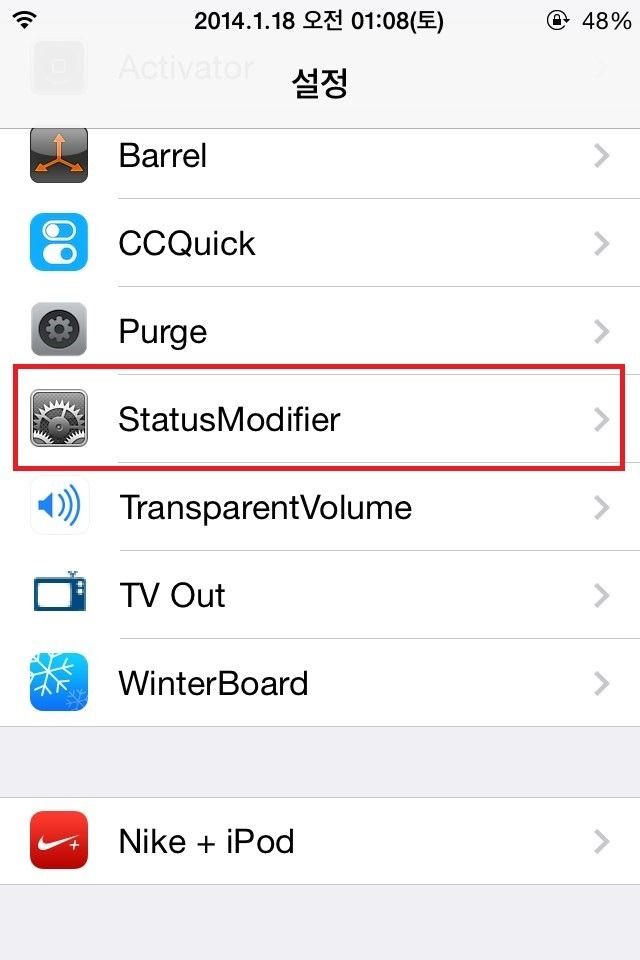 iOS6에서는 StatusBarCustomClock4 트윅으로 상단바에 표시되는 정보를 수정했었는데, iOS7에서는 StatusModifier 트윅으로 상단바 내용을 수정할 수 있게 되었습니다.