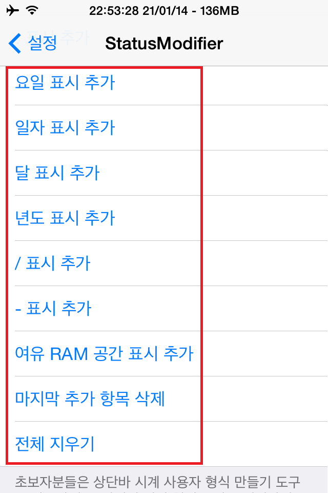 아이폰 상단바(상태바)에 월 일 요일 가용램 표시해 주는 시디아 트윅, StatusModifier 2.0.1 업데이트