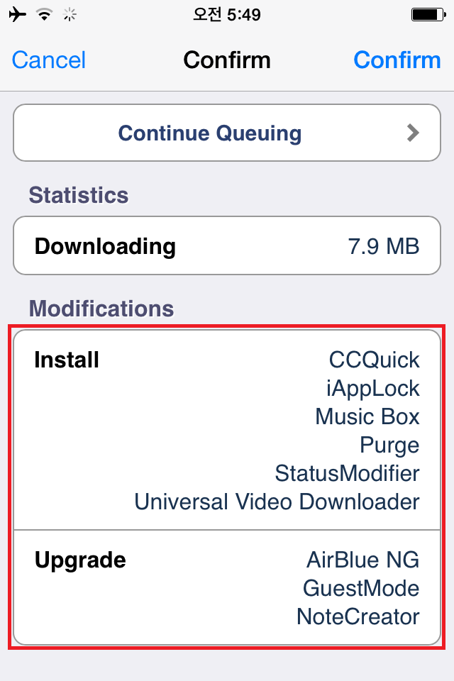 STEP2. 화면 상단 오른쪽의 Confirm을 누르는 것이 아니라 Continue Queuing을 터치합니다. 그러면 트윅이 설치되지 않고 시디아 화면 하단 메뉴 중 Manage에 Q'd 라고 표시가 됩니다. 이것은 방금 설치하려고 했던 트윅의 설치를 보류한다는 뜻입니다.