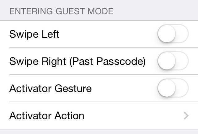 잠금화면에서 GuestMode 진입 방법을 설정하는 메뉴입니다. 진입 방법은 3가지인데요. 위에서부터 왼쪽으로 밀기, 오른쪽으로 밀기, Activator 액션 이용하기입니다.