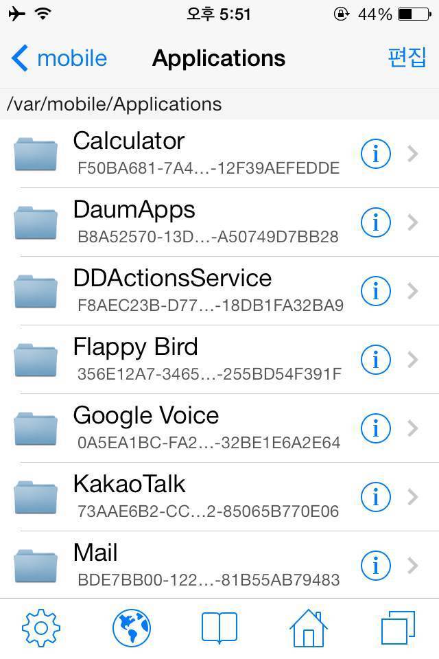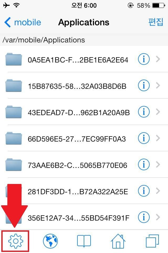 STEP1. iFile을 실행해 /var/mobile/Applications 폴더로 들어갑니다. 그러면 아래와 같은 화면이 나오는데요. 이 폴더는 아이폰에 설치되어있는 어플들이 모여있는 폴더입니다. 그러나 아래 그림과 같이 폴더명이 어플 이름이 아닌 숫자와 영어로 조합된 단어들로 보인다면 폴더명을 어플 이름으로 보이게끔 설정을 바꿔줘야 하는데요. 화면 하단 왼쪽의 설정(톱니바퀴모양)을 터치합니다.