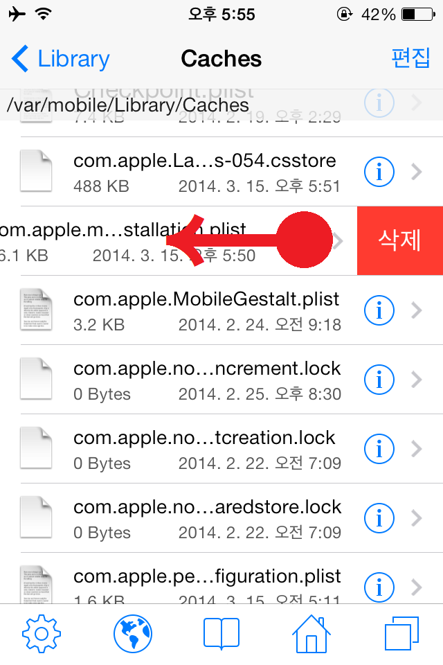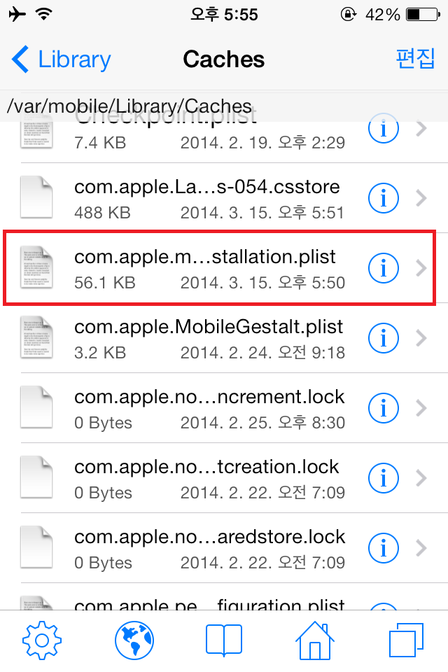 STEP9. /var/mobile/Library/Caches 폴더로 이동합니다. 그리고 폴더안의 파일 중 com.apple.mobile.installation.plist 파일을 삭제합니다.