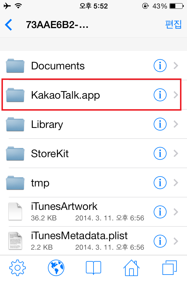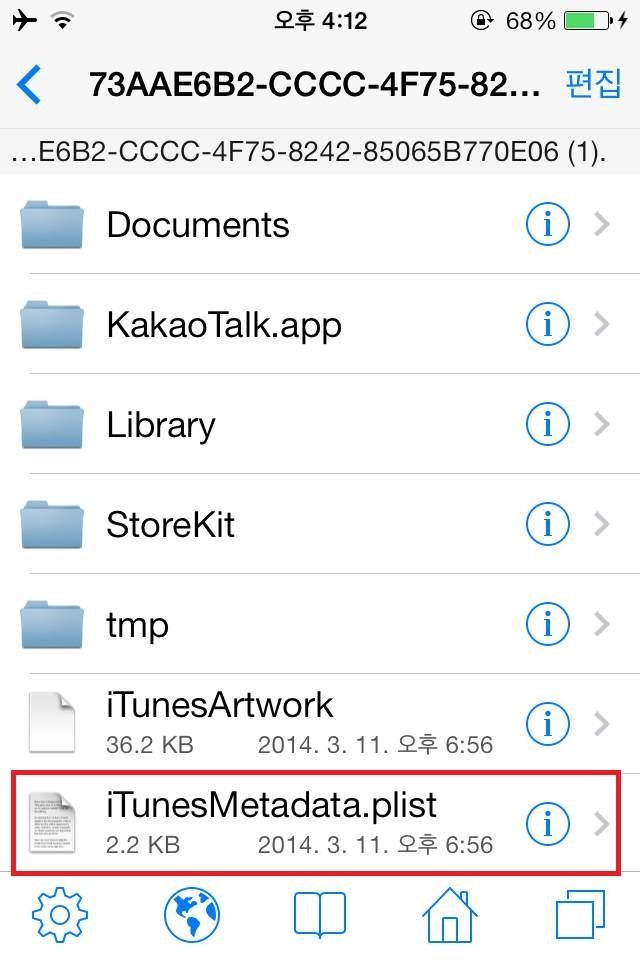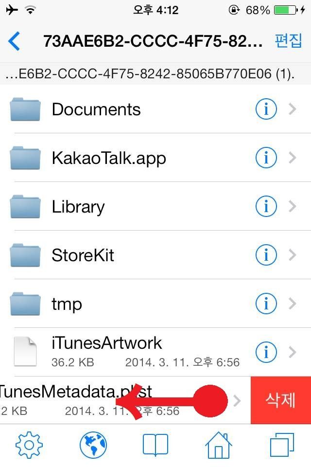 STEP5. 복사한 어플 폴더를 터치해 안으로 들어갑니다. 거기서 iTunesMetadata.plist 파일을 삭제합니다.