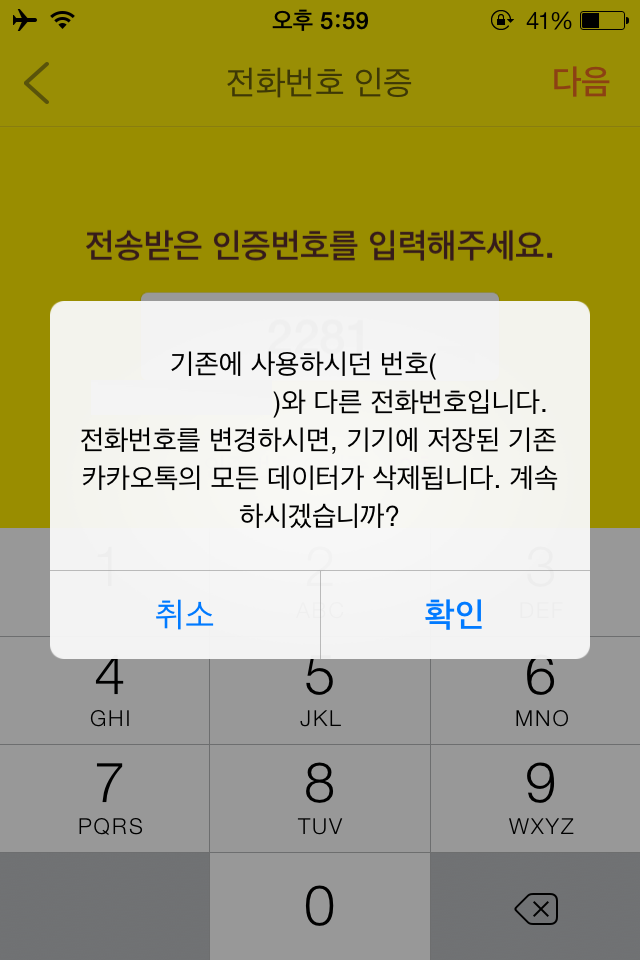 복제한 카카오톡 어플의 경우 처음 실행할 때 휴대전화번호 인증과정에서 아래 그림과 같은 팝업창이 나타날 때도 있는데요. 내용은 무시하고 확인 버튼을 눌러주면 됩니다. 전화번호를 변경하시면, 카카오톡의 모든 데이터가 삭제된다고 하는데 확인 버튼을 눌러도 데이터는 삭제되지 않습니다.^^